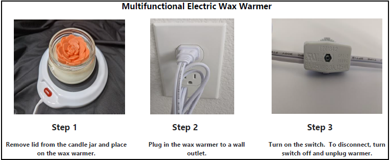 Warning: Turn warmer off after candle has melted for fragrance to continue to release. Do not leave the warmer on for more than 2 hours at a time. Warmer must be on a flat heat resistance surface while in use.